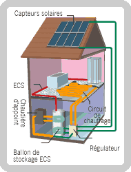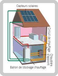 Le soleil n'étant pas présent toute la journée ni toute l'année, l'idée consiste à stocker la chaleur produite par les capteurs dans un volume d'eau tampon, dans lequel on vient puiser lorsque cela est nécessaire. L'énergie nécessaire au chauffage est diffusée dans la maison soit grâce à des radiateurs, de préférence fonctionnant à basse température, soit grâce à un plancher chauffant. Les progrès de la recherche, notamment sur la régulation et la gestion du stockage de l'énergie dans les ballons, permettent de réaliser aujourd'hui des systèmes performants et compacts dont le volume est acceptable (de 500 à 2 000 l)